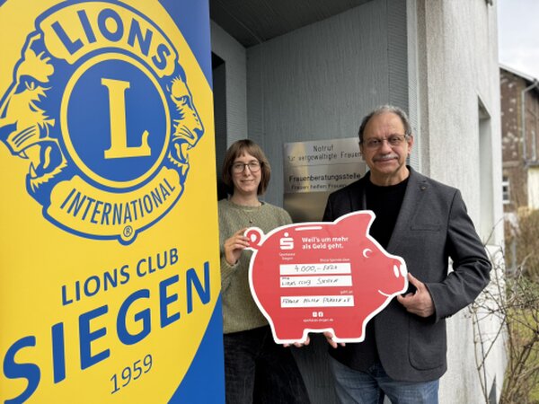 Der Lions Club Siegen hat am 18. Dezember 2025 eine Spende in Höhe von 4.000 Euro an den Verein Frauen helfen Frauen e.V. übergeben. Die Spende wurde vom Präsidenten des Lions Club Siegen, Herrn Jörg Müller, sowie vom Vorsitzenden des Lions Fördervereins Siegen e.V., Herrn Harald Peter, an Frau Alica Mielke als Vertreterin des Vereins überreicht.